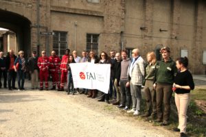 Ingresso della mostra con Prof.ssa Cecilia Prete e alunne, con Prof. Dionigi Roggero, M. Teresa Bergoglio, funzionaria del Parco del Po di Casale e Prof.ssa Cristina Debernardi Bonzano, presidente Delegazione FAI Casale